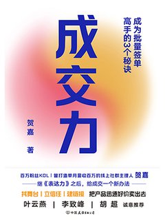 【简介】【内容简介】 随着时代的发展,传统的销售方法和销售体系逐渐暴露出一些问题。如何找到目标用户?如何建立用户对你的信任?如何让用户愿意主动来找你? 如何让用户能够持续地给你转介绍心用户?《成交力》这本书从找舞台、立信任、建链接出发,细致分享了成为批量签单高手的3个秘诀。作者贺嘉为了找到这些问题的解决方案,从0到1搭建了这套批量成交的体系,旨在助你把产品迅速好价卖出去。